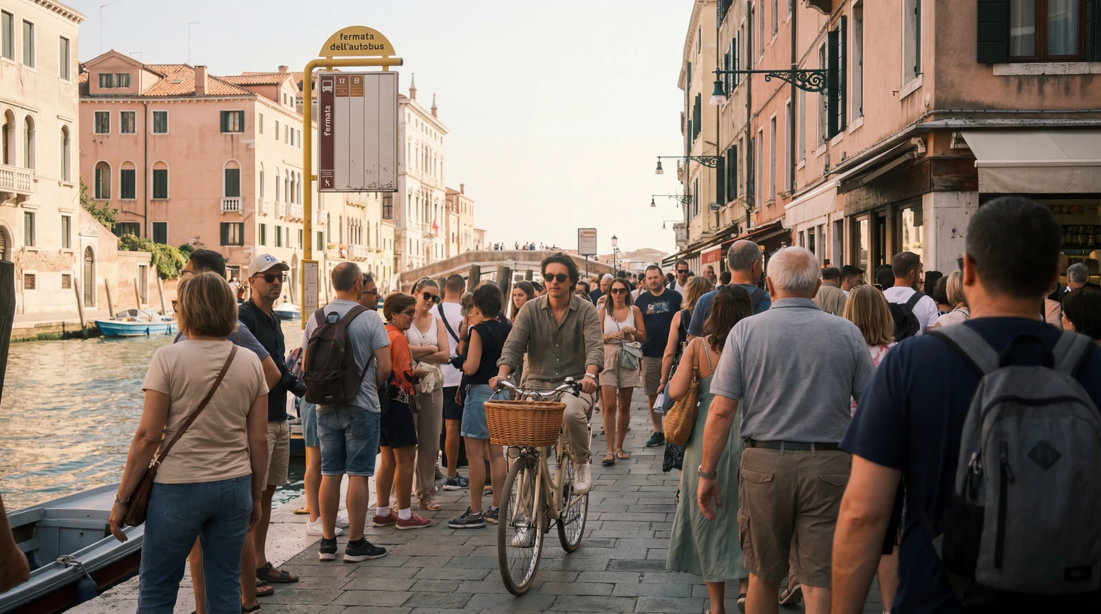 [Subject] A candid street photograph of a bicycle running hurriedly in a crowd at a bus stop in the afternoon [Composition] A 16:9 ratio rangefinder photograph, landscape orientation with a full body shot framing. shot from a natural, observational perspective [Location] Set in Venice Canals, densely packed crowd [Lighting] natural light, clear sky [Tech Specs] FILM_LEICA_M3, 28mm wide lens look, limited bokeh, subtle subject separation at close distances, light natural corner shading, subtle peripheral falloff [Style] summer mood, crystal clear air, warm pastel tones, soft color palette, natural skin rendering, gentle highlight roll-off, matte film finish.