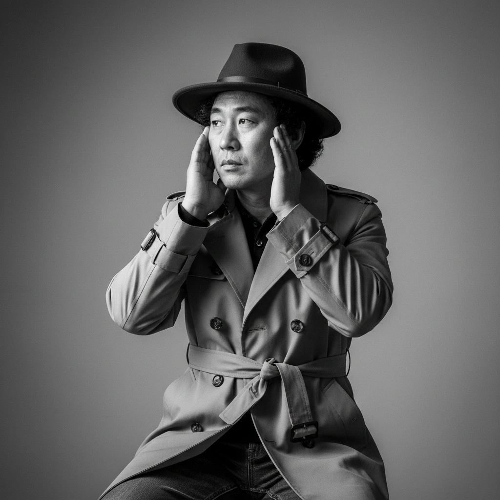 [Subject] A Korean middle-aged man in his 40s-50s with a fair complexion and an athletic build, featuring an oval face, dark brown eyes, and curly jet black hair [Fashion] wearing a classic trench coat, blue jeans, and a fedora hat [Composition] A 1:1 ratio DSLR photograph, landscape orientation with a medium shot framing. engaging conversational perspective, standard broadcast framing, approachable vibe [Expression/Pose] in standing naturally, relaxed posture with hands framing the face, a serious expression, and a side gaze [Location] neutral gray studio backdrop [Lighting] balanced Loop lighting with soft diffused quality, natural contrast ratio, daylight white balance, natural mood [Tech Specs] Shot on a Nikon D850 with a Nikon AF-S 24mm f/1.4G ED lens. Shallow depth of field (f/1.4) creates Creamy smooth bokeh, excellent subject isolation that perfectly isolates the subject. Noticeable corner shading adds artistic depth to the image. [Style] black and white photograph, high contrast, rich film grain, deep blacks with luminous highlights, classic documentary feel.