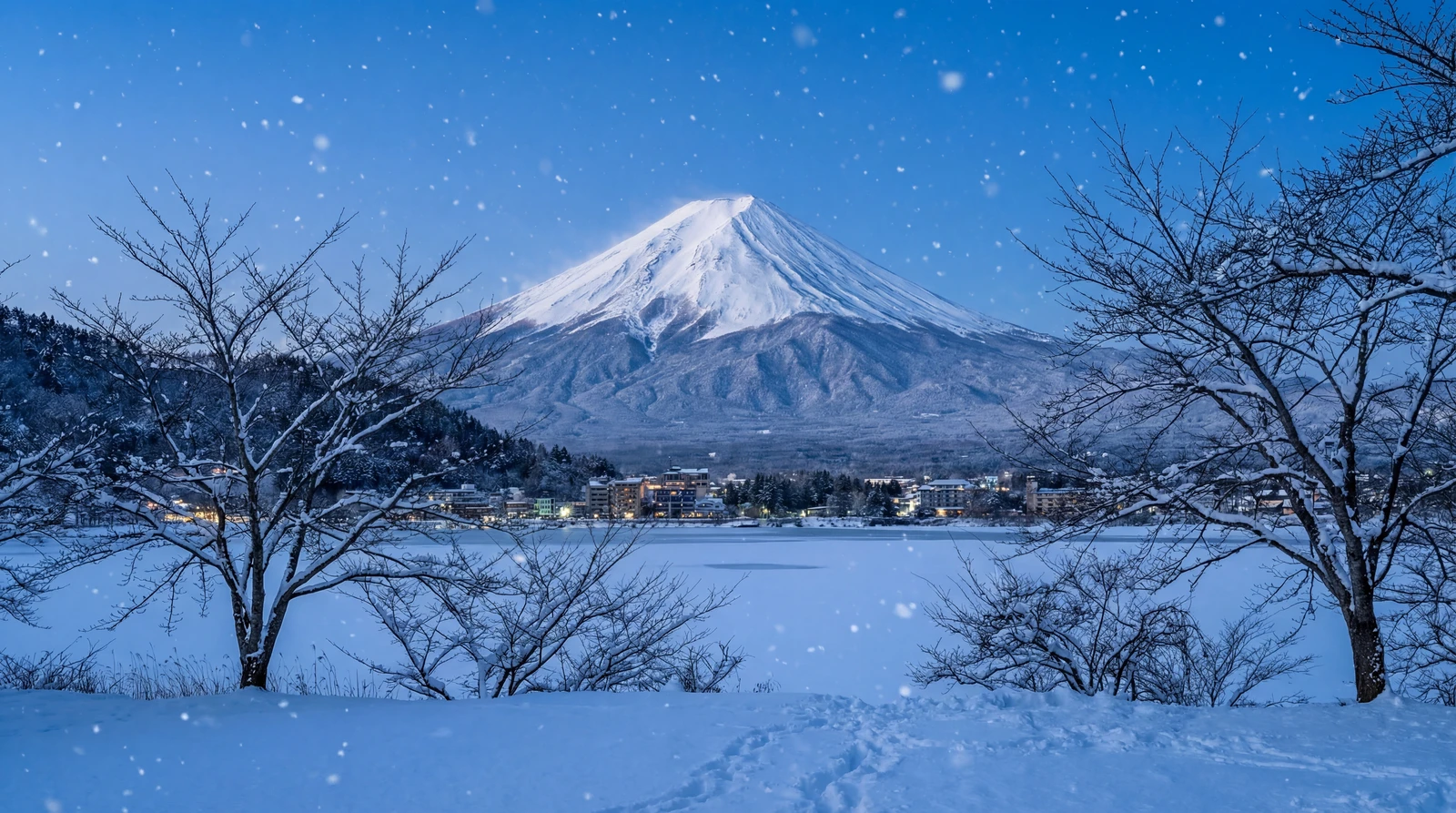 [INSTRUCTION] Create a photorealistic National Geographic-quality landscape photograph with natural color grading, sharp focus throughout, and balanced exposure. [SUBJECT] Mount Fuji in Fujinomiya, Japan Coordinates: 35.3606°N, 138.7274°E [COMPOSITION] Camera positioned at ground level, facing North, medium distance, using 24mm wide-angle lens. [ENVIRONMENT] Weather: heavy snowfall, winter wonderland, pristine Season: bare trees, possible snow, crisp air, cool tones Time: pre-dawn darkness, quiet atmosphere, deep blue sky Atmosphere: transparent air, no atmospheric effects, maximum detail [CAMERA] Body: Nikon D850 Lens: AF-S NIKKOR 24mm Aperture: f/5.6 ISO: ISO 200