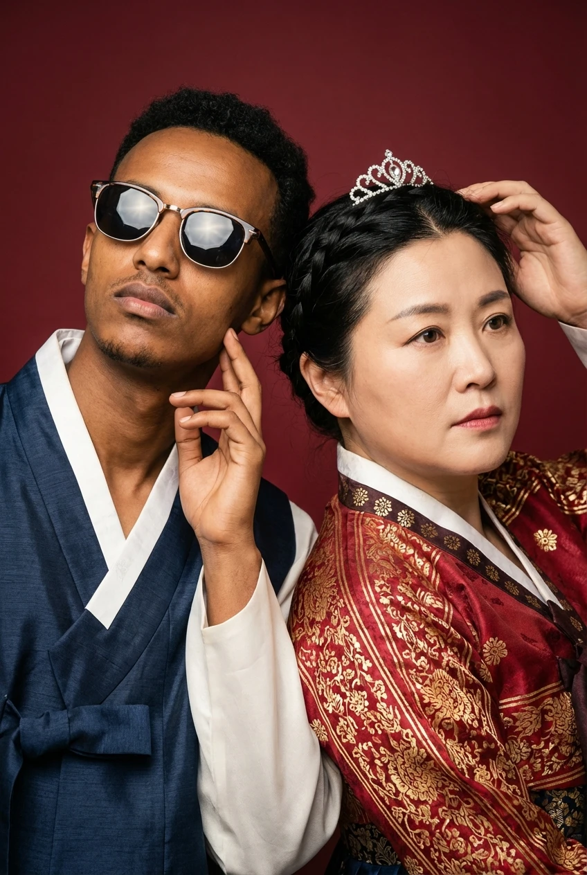 Display the following 2 people together in a single unified photograph without any dividing lines or frames. [Subject] - Person 1: A Ethiopian young man in his late 20s with a olive tan complexion and a slim build, featuring an oblong face, dark brown eyes, and jet black hair - Person 2: A Chinese Northern middle-aged woman in her 40s-50s with a fair complexion and a curvy build, featuring an oblong face, dark brown eyes, and braided jet black hair [Fashion] - Person 1: wearing a traditional Korean hanbok jeogori and a stylish sunglasses - Person 2: wearing a traditional Korean hanbok jeogori and a sparkling tiara [Composition] A 2:3 ratio DSLR portrait with a bust shot framing. capturing deep emotional connection, detailed facial features, intense eye contact [Expression/Pose] - Person 1: in asymmetric shoulder line, head tilted slightly opposite to shoulders, dynamic neck tension with hands near face, editorial finger placement, elegant hand pose, a pensive thoughtful expression, and looking upward - Person 2: in asymmetric shoulder line, head tilted slightly opposite to shoulders, dynamic neck tension with hand touching hair near temple, fingers in hair, a pensive thoughtful expression, and looking off-camera [Location] wine red studio backdrop [Tech Specs] Shot on a Nikon D850 with a Nikon AF-S 35mm f/1.4G lens. Shot at f/2.8 aperture.