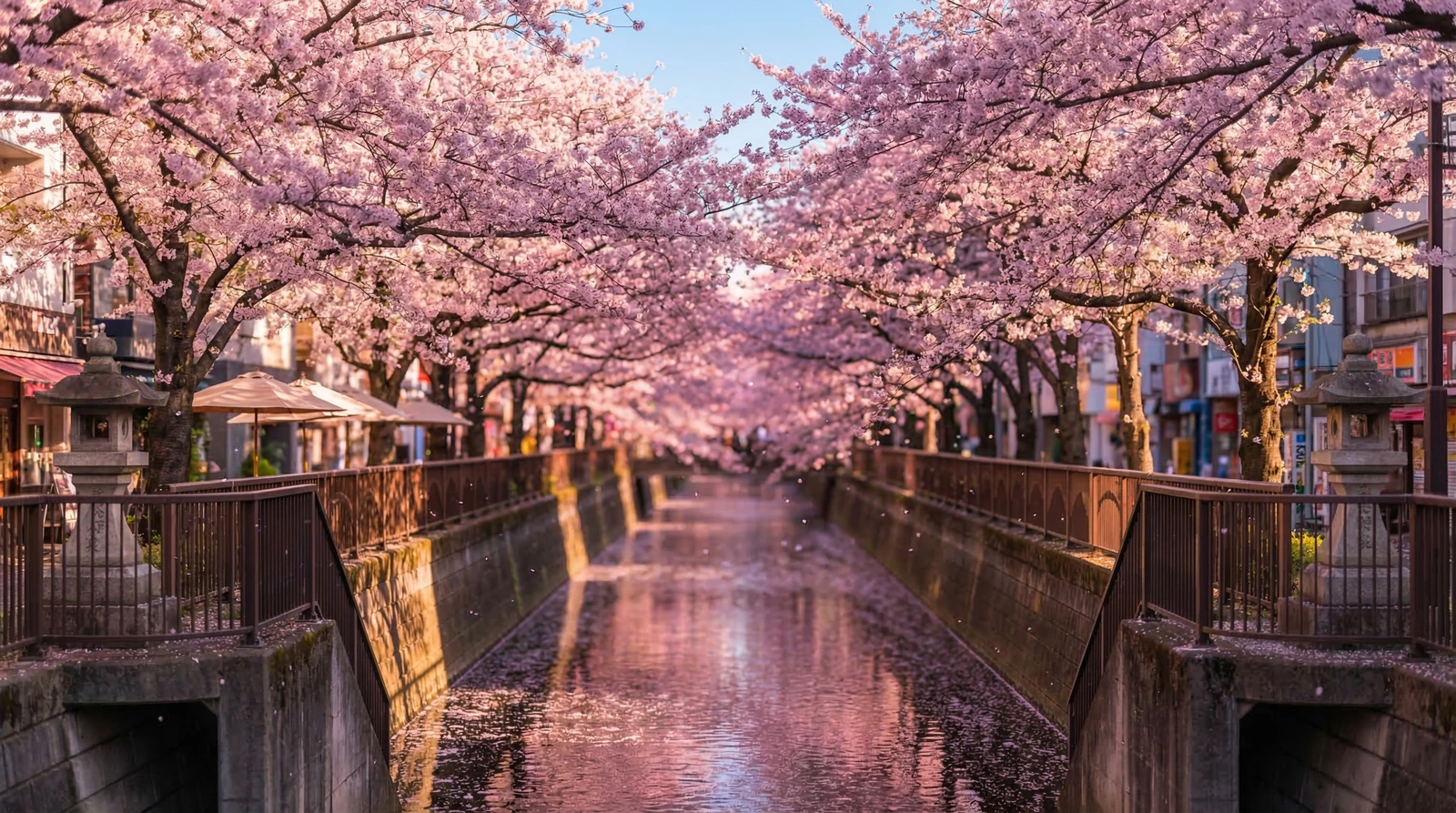 Meguro River sakura tunnel, Nakameguro Tokyo. 400mm telephoto compression, camera at canal level facing north down the river corridor. Peak bloom, golden morning light 7AM. Dense sakura canopy both banks, petals drifting on water. Foreground lanterns sharp, mid-ground canal soft, background café awnings and cherry trees compressed into a single pink bokeh wall. Sony A7R V, 400mm, f/6.3, ISO 100, 1/500s, 5500K. Photorealistic, National Geographic quality, no HDR.